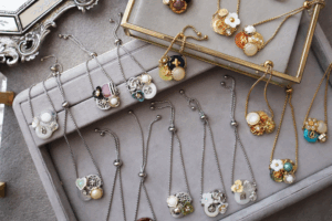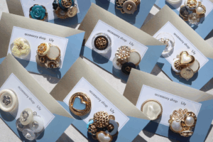 作品はすべて一つひとつ丁寧に手作りしています。アンティークボタンや個性的な素材を組み合わせたデザインは、身につけるだけで心が躍る唯一無二の一点もの。大切な方への贈り物や、自分へのご褒美としても喜ばれています。占いをもとにしたオーダーメイドだけでなく、新作や一点物の作品も販売しています。